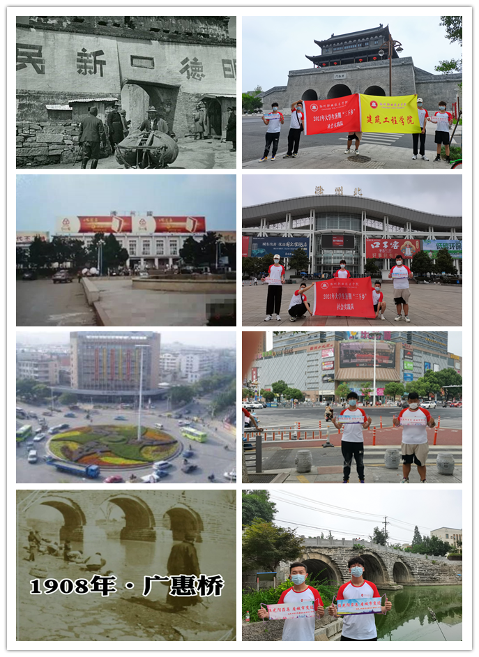 建筑是一个城市历史文化的缩影,记载着城市经历的世事,沧桑变化。实践小分队通过查找资料、走访、参观城市规划馆以及寻找影像资料等方式,对比发现家乡在基础设施、城市面貌以及城市文化等方面的发展与变迁以及了解家乡的总体规划。