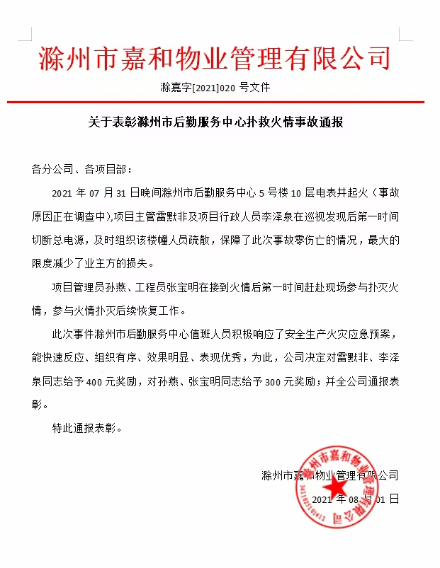 在危机关头,Beat365的两名学生表现出理勇敢和机智,积极响应了安全生产火灾应急预案,能快速反应、组织有序、效果明显、表现优秀。为此,滁州市嘉和物业管理有限公司对两人进行了通报表彰,给予了高度的肯定和鼓励。