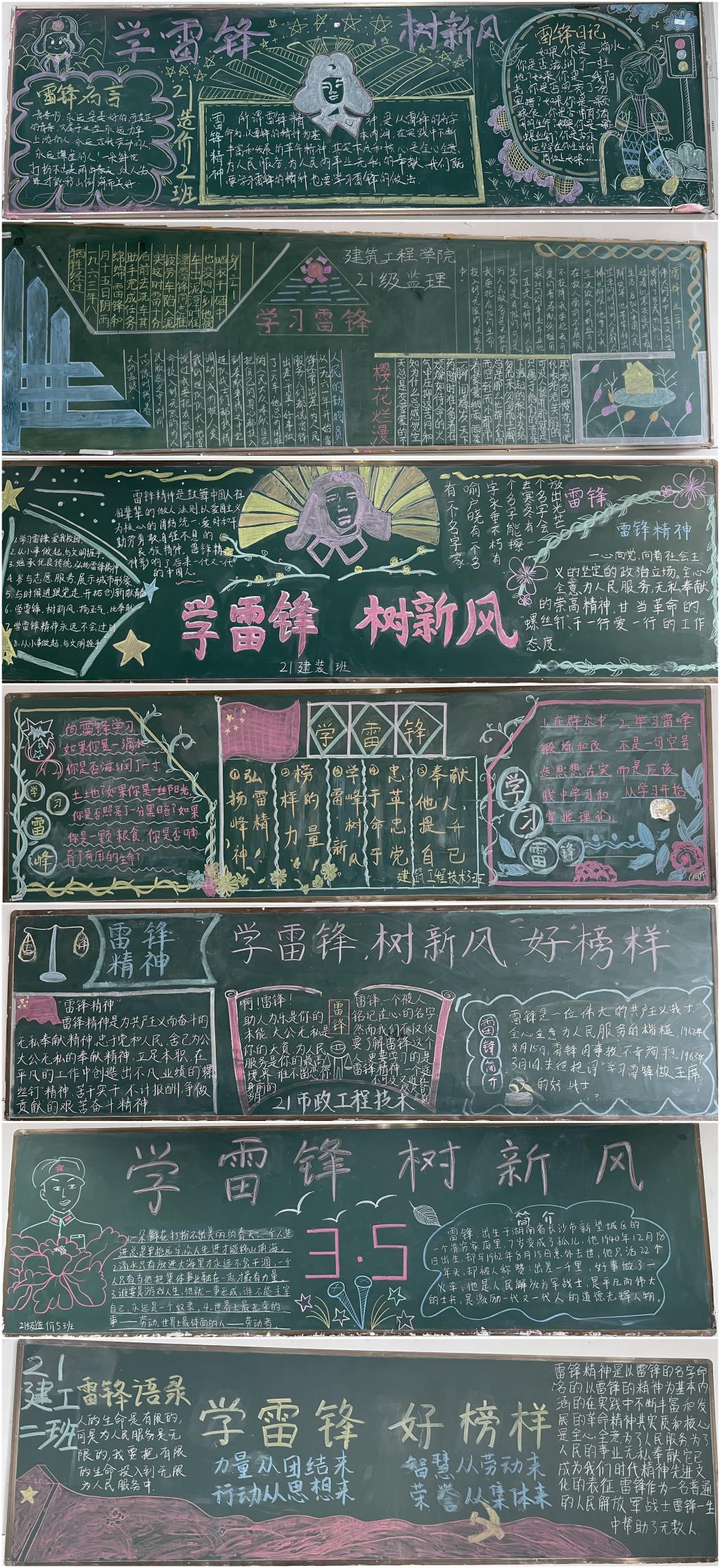 为弘扬雷锋精神,营造浓厚的学雷锋氛围,丰富校园文化,展现学生风采,3月8日—3月12日,建筑工程学院团总支、学生会组织开展“学雷锋 悟精神”主题黑板报、海报、手抄报展示活动。