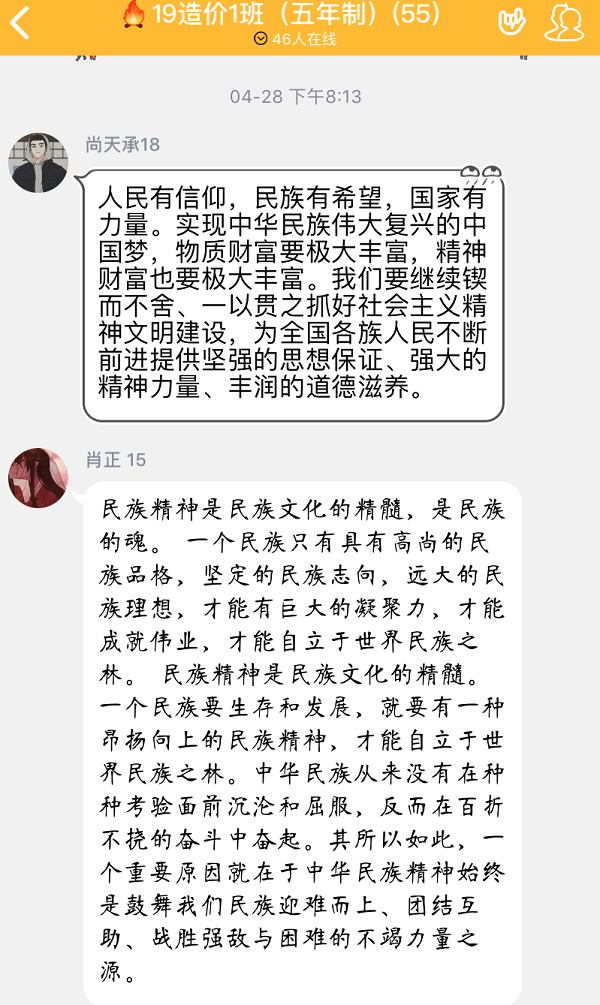 建筑工程学院19级工程造价一班五年制于5月4日晚线上开展了“弘扬五四,创造青春辉煌”的团日活动,本次活动由团支书周慧文主持,19造价1班全体成员参加。