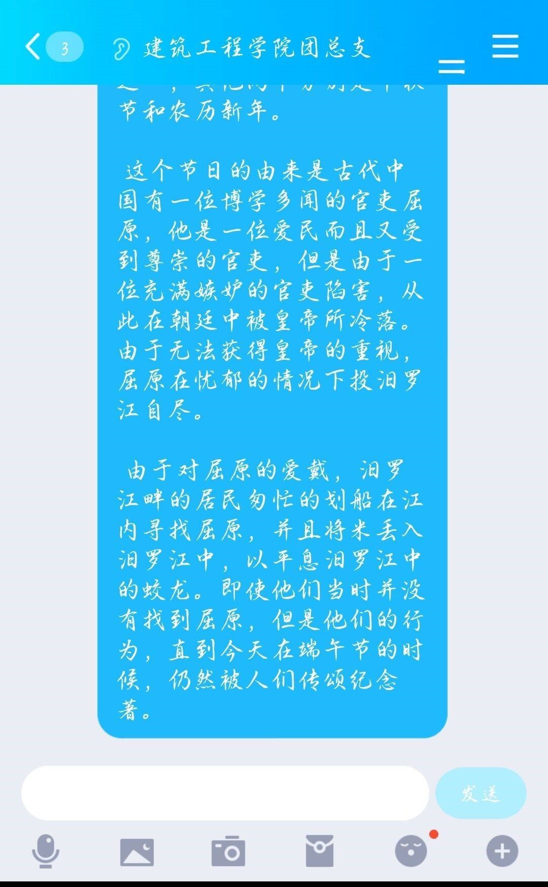 为让大家了解端午节的来历和传说故事,并着重宣传爱国诗人屈原以及中华民族优秀代表人物的事迹,感受中华民族传统节日中折射出的浓郁的文化气息,不断激发群众的爱国主义精神,建筑工程学院团总支结合实际,在线上组织观看了纪录片:我们的节日•端午。