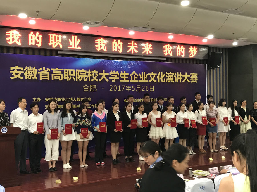 2017年5月26日,安徽省高职院校大学生企业文化演讲大赛全省总决赛在安徽水利水电职业技术学院图书馆学术交流中心隆重举行。本次大赛由安徽省职业与成人教育学会、安徽省高等学校图书情报工作委员会、安徽省高等学校数字图书馆联合主办,安徽省水利水电职业技术学院承办,北京碧虚文化有限公司(碧虚网)协办。经过前期选拔,我院16级旅游管理专业李雪梅、16级工商企业管理专业邹子桓代表我院参加本次比赛。