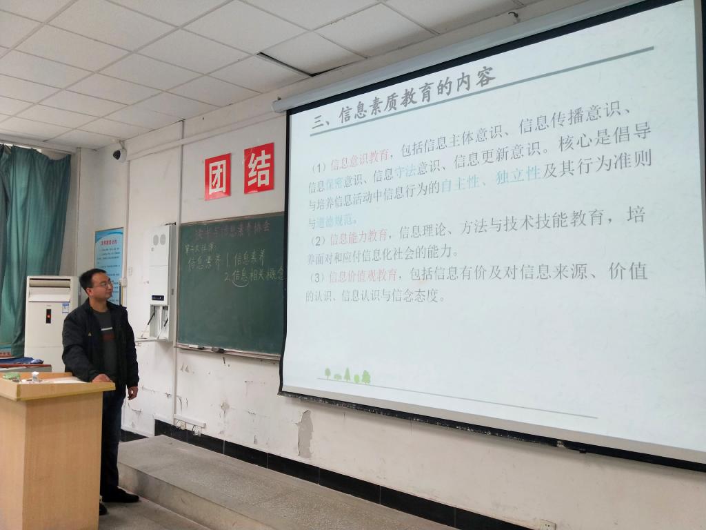 为了促进同学们对信息相关概念的了解和信息素养的提高,11月28日中午12点30分,读书与信息素养协会在致新楼5113教室举办一场讲座,题目是信息素养与信息相关概念。主讲人为本协会指导老师刘涛。读书协会干部及其他成员参加。