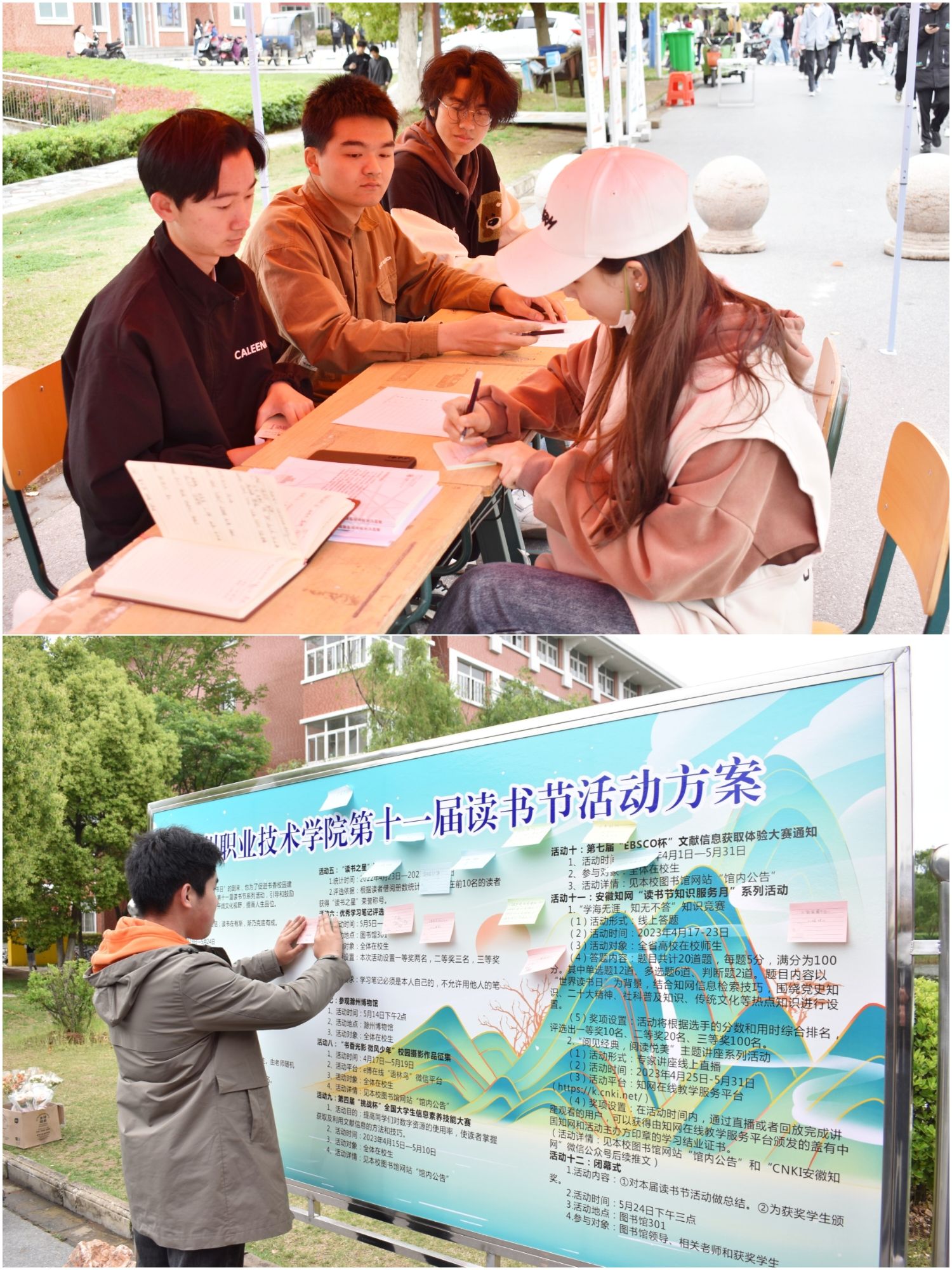 4月24日早上,校学生会成员在小池塘边搭好帐篷,摆好“工作台”。4月24日至25日,路过的同学在“好书推荐表”上写下自己最喜欢的书籍,然后在便利贴上写下心愿,贴到展板上。小小的“墙”,小小的纸,小小的心愿,藏着无数个美好的憧憬和青春。