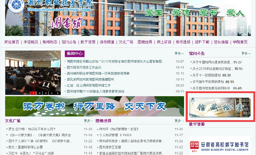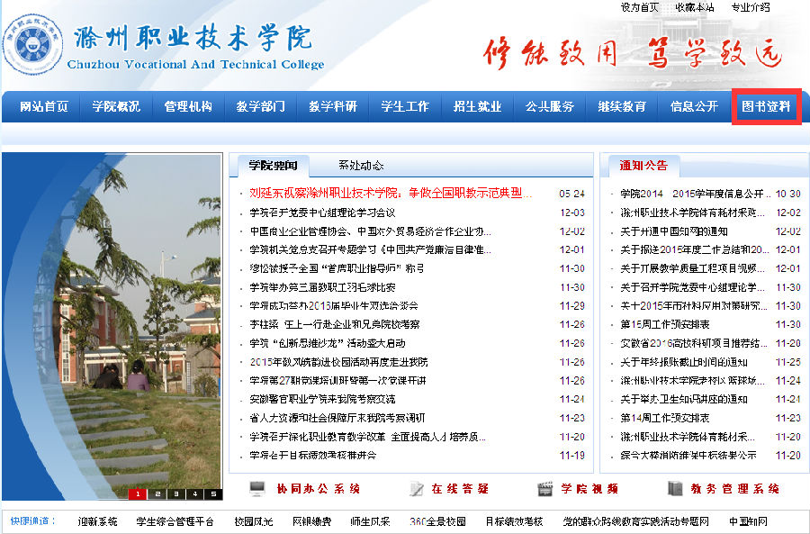 第一步:登录学院网站,点击“图书资料”: