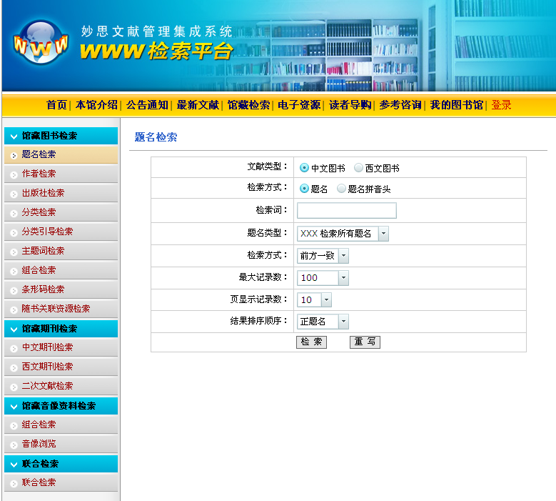第三步:进入妙思系统检索平台,您可通过“作者检索”或“题名检索”查询您想借阅的图书是否存在于本馆或查询馆藏索取号: