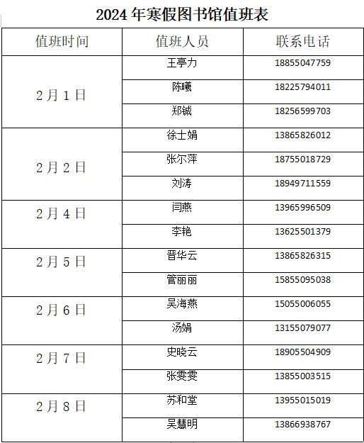 4.寒假期间如遇到需要协调的工作时,请及时与值班老师联系。