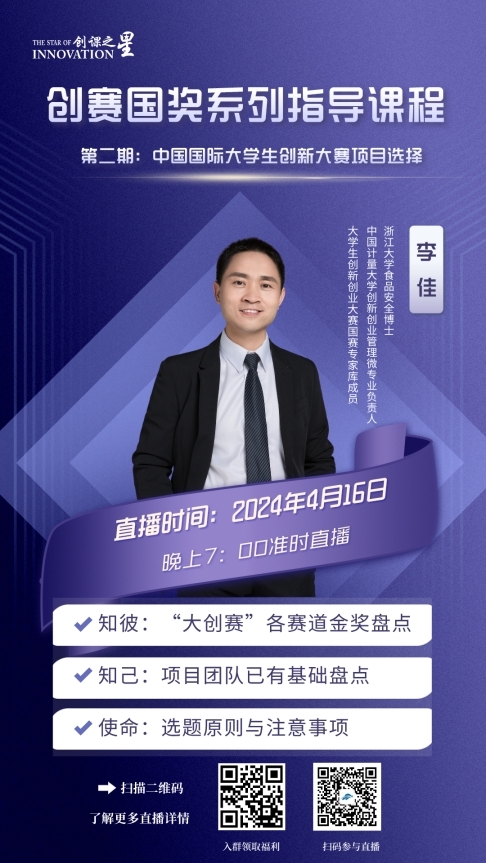 4月16日将开展“大学生创新大赛的项目选择”直播活动,欢迎大家收看。