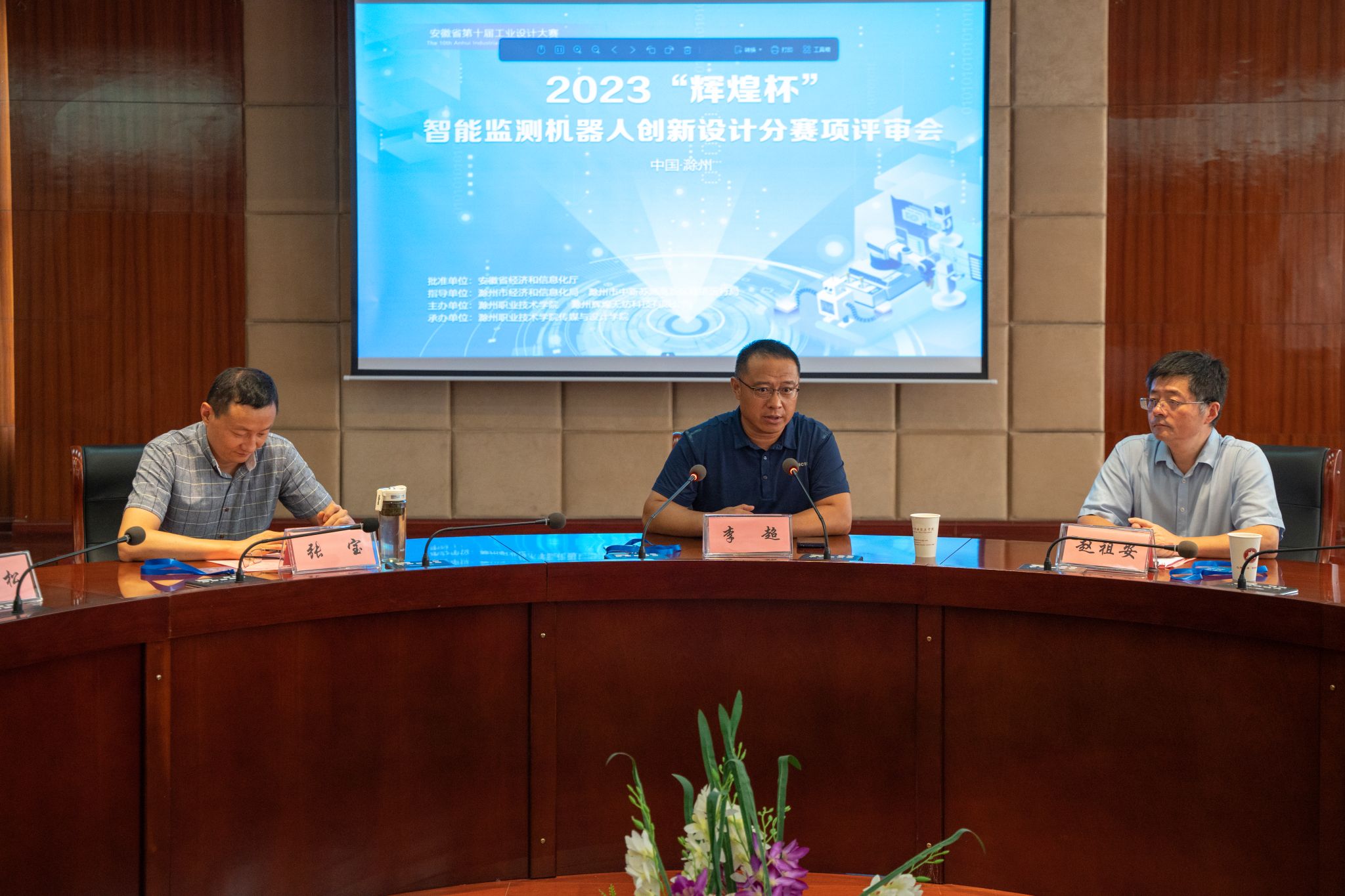 8月25日下午,在安徽省经济与信息化厅的批准和指导下,Beat365传媒与设计学院与滁州辉煌无纺科技有限公司共同主办的安徽省第十届工业设计大赛“辉煌杯”智能监测机器人创新设计分项赛在Beat365综合楼11楼会议室顺利召开。校党委委员、组织人事处处长李超,滁州市经济和信息化局二级调研员赵祖安,中新苏滁高新区经济运行局局长陈涛,滁州市经信局规划与产业政策科科长刘飞,滁州辉煌无纺科技有限公司总经理付昌辉,滁州学院博士刘世平以及传媒与设计学院党政领导班子成员出席本次评审会。会议由传媒与设计学院院长闻建强主持。