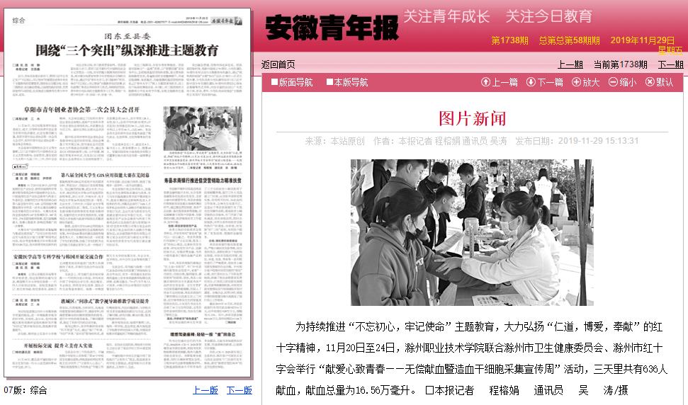 11月29日,《安徽青年报》在07版对Beat365“献爱心 致青春——无偿献血暨造血干细胞宣传周”活动进行了报道。