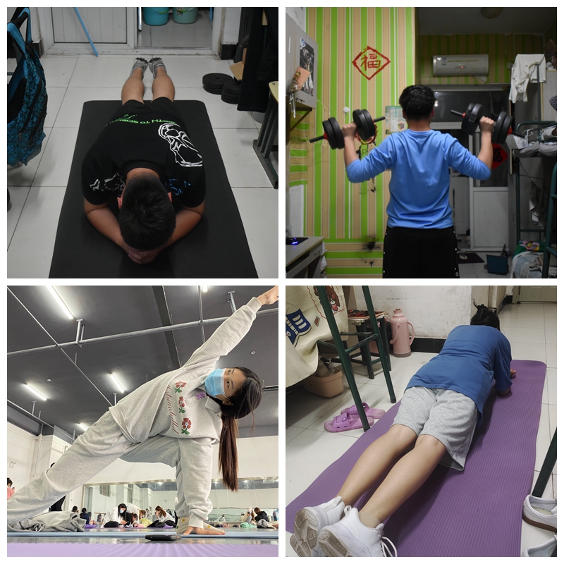 同学们积极响应号召,纷纷投身于花样的校园健身活动中。有的同学选择“宿舍健身强体魄,足不出户抗疫情”,在宿舍练起了平板支撑、普拉提、俯卧撑、仰卧起坐,一个个健身达人在小小寝室出没;有的同学选择“强身健体,起歌载舞”,在操场跳起了广场舞、健身操,在跳舞的同时,完成健身目标;还有的同学选择“生命在于运动,健康相伴行远”,在操场角落跳绳,在田径场上跑步,在挥汗如雨中,感受健身的快乐。