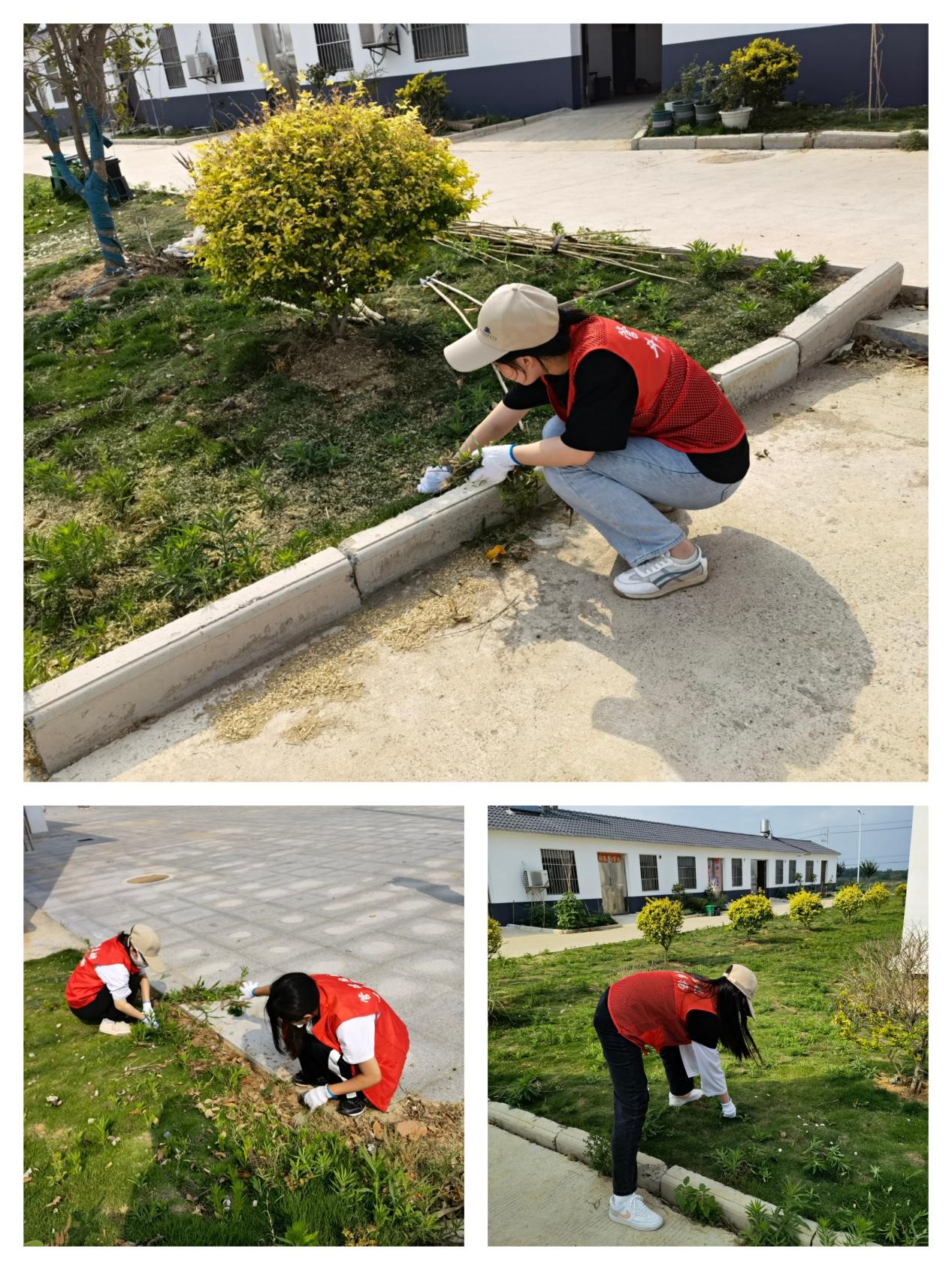 当天下午,实践团帮助当地工作人员进行除草驱虫,面对横生的杂草,大家分成小组,划分劳动区域,发扬不怕脏、不怕苦、不怕累的劳动精神,一丝不苟清理杂草与枯枝败叶,干劲十足,不放过一个死角。夕阳西下,劳动也接近尾声。实践团站在夕阳下,高举团旗,用高亢洪亮的声音唱响团歌,用自己勤劳的双手绘制美好的蓝图。