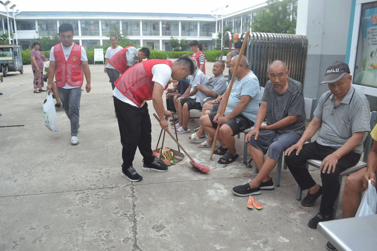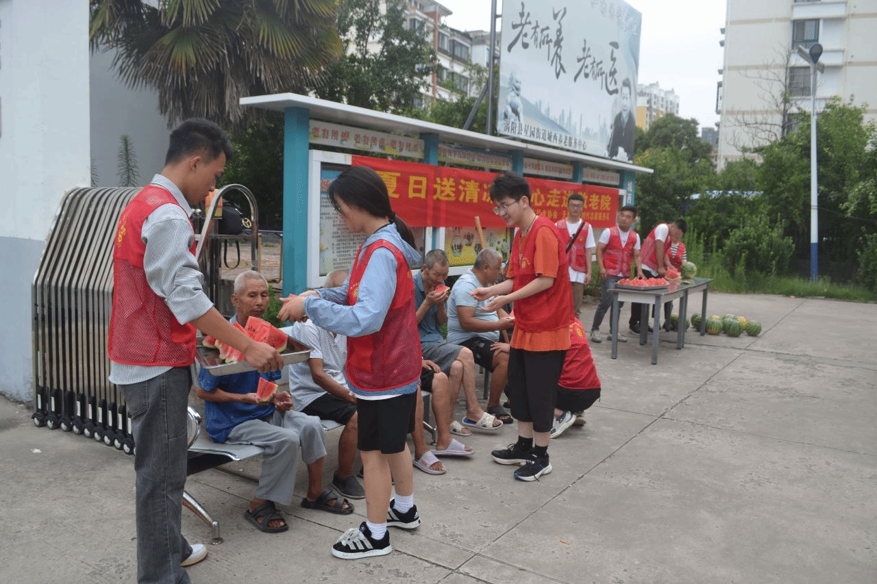 在敬老院中,志愿者们将志愿者协会准备的西瓜及降暑用品送到老人们手中。志愿者们一边为老人们修剪指甲,一边与老人们聊天,详细询问老人们的身体和生活状况。开展志愿服务活动,让孤寡老人们在感受到社会的关爱和温暖。