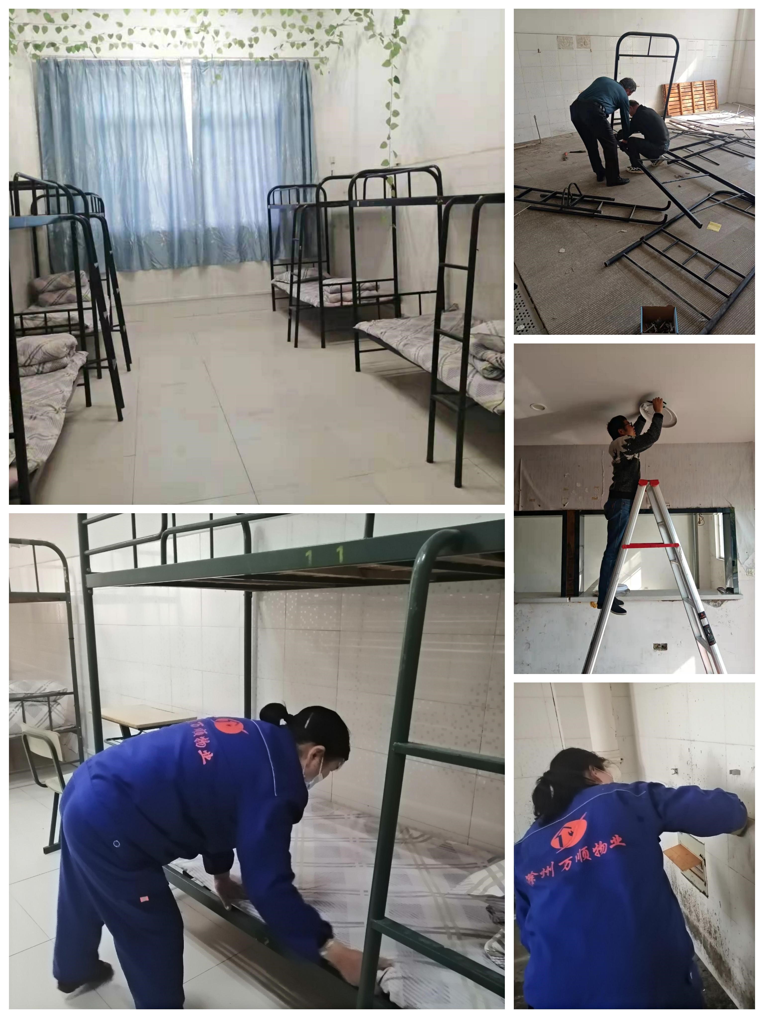 为了做好封校期间的疫情防控工作,临时增加设置集中隔离点,各部门分头行动,物业人员打扫卫生,维修人员迅速从学生公寓调运16套上下铺铁床,加急组装,安装窗帘,检修水电,公寓人员从综合楼调运床上用品,在最短时间内完成隔离点的设置任务,全面落实学生师生隔离保障工作。
