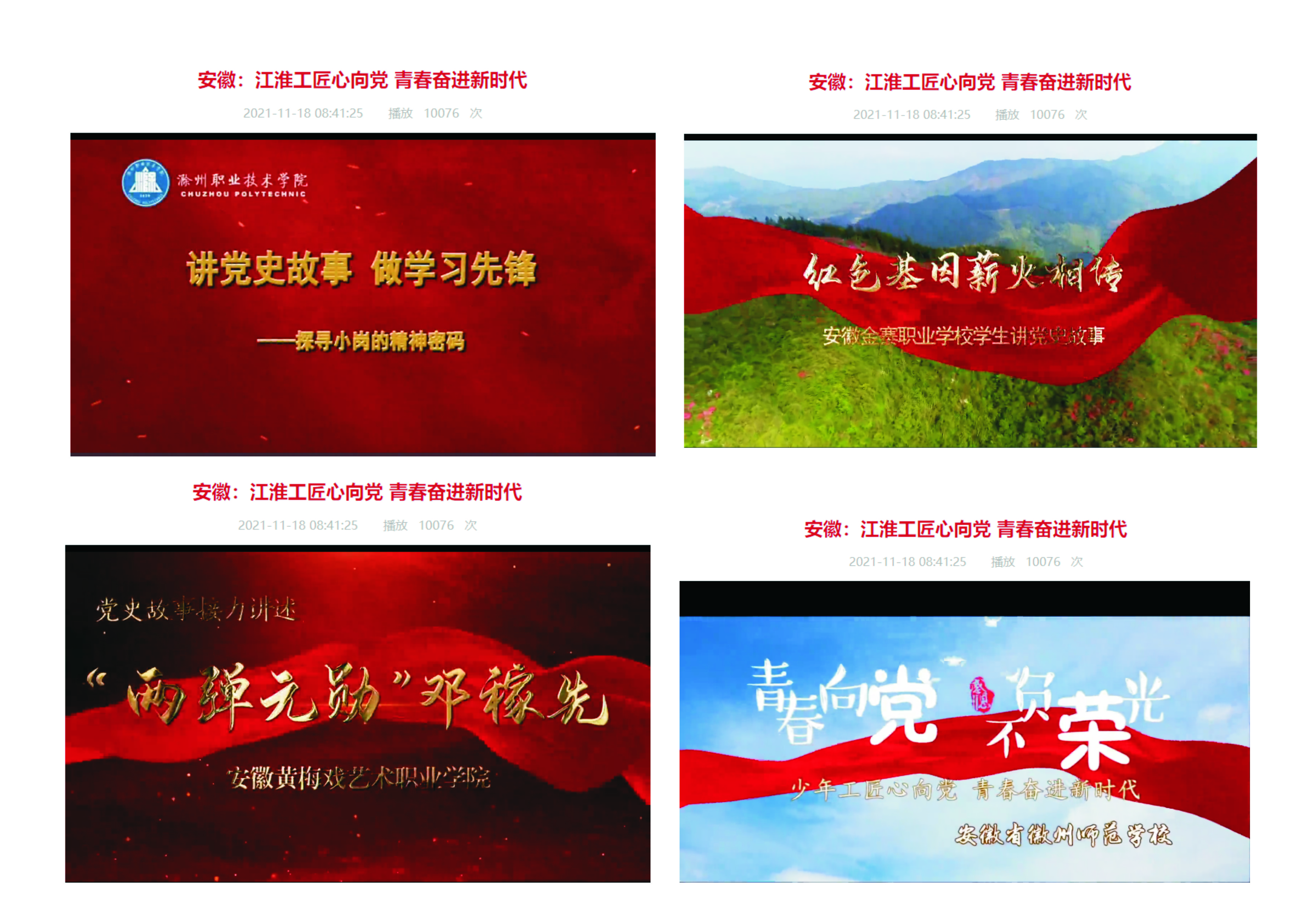 近日,教育部在全国高校思想政治工作网展播了全国职业院校党史学习教育成果展。由Beat365宣传统战部制作、报送的《讲党史故事 做学习先锋—探寻小岗的精神密码》微视频作为安徽省优秀作品入选,同时入展的还有安徽黄梅戏艺术职业学院、安徽金寨职业学校、安徽省徽州师范学校。