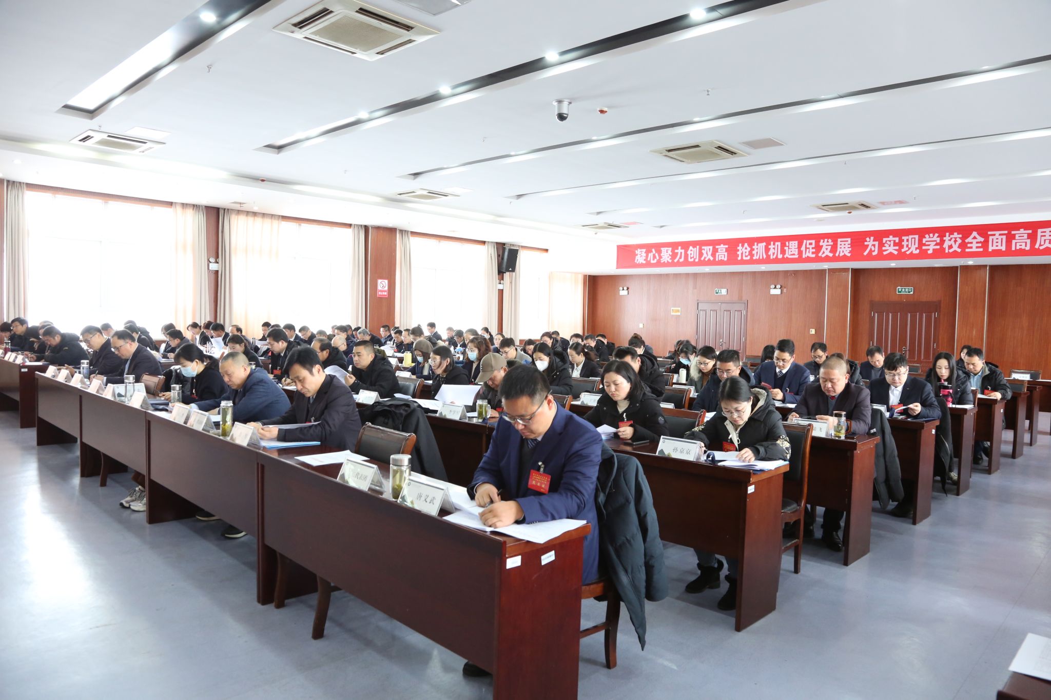 许雪峰代表学校向大会作题为《攻坚克难勇担当 行稳致远启新程 全面推进省级“双高校”建设》的工作报告。许雪峰指出,2023年,在市委、市政府的坚强领导下,在省教育厅的悉心指导下,全校上下坚持以习近平新时代中国特色社会主义思想为指导,深入学习贯彻党的二十大精神,紧紧围绕创建省级“双高校”的目标任务和年度154项重点工作,不断加强内涵建设,夯实发展基础,深化教育教学改革,稳步推进学校各项事业高质量发展。