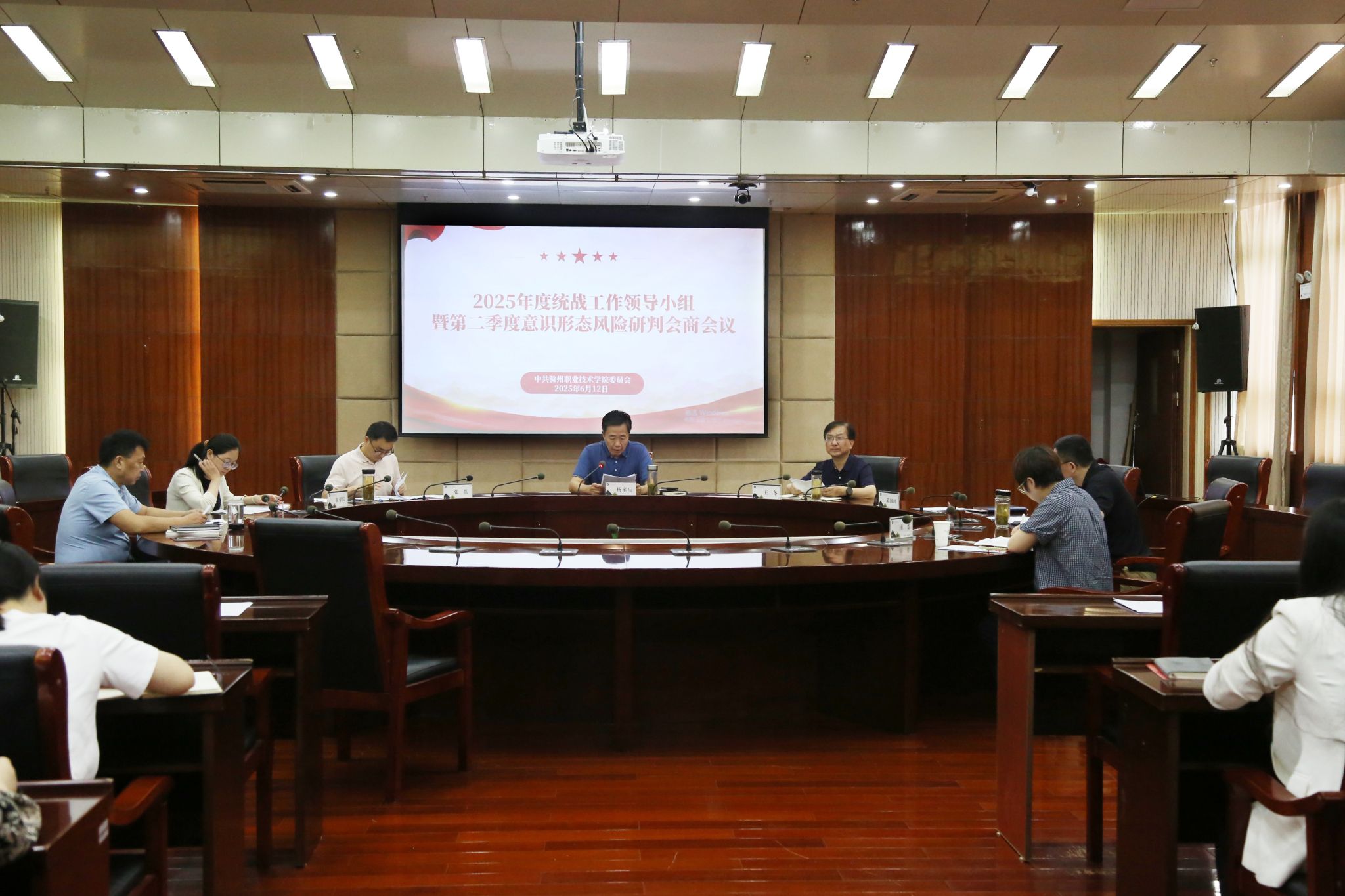 6月12日下午,学校在综合楼11楼会议室召开2025年统战工作领导小组暨第二季度意识形态风险研判会商会议,校党委副书记杨家庆,校党委委员、宣传统战部部长王冬出席会议,各党总支(直属党支部)负责人、各部门负责人参加会议。