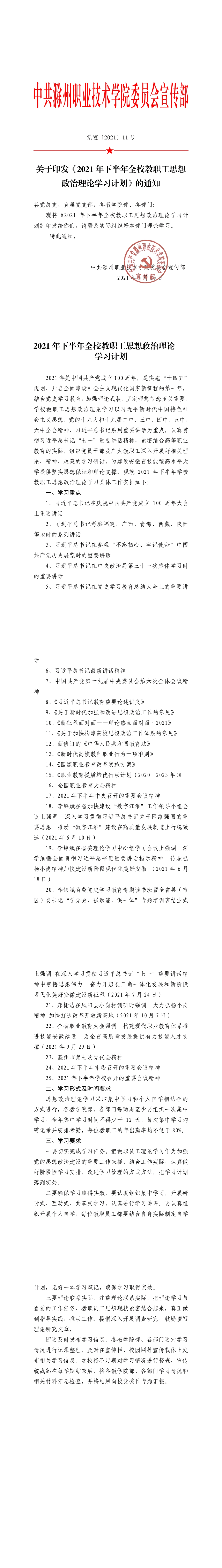 关于印发《2021年下半年全校教职工思想政治理论学习计划》的通知