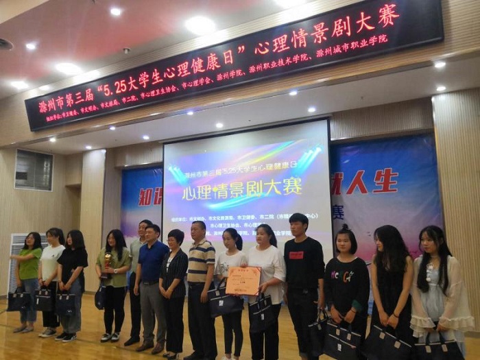 5月25日下午,滁州市第三届“5.25”大学生心理情景剧比赛在滁州城市职业学院图文中心四楼报告厅成功举办。本次大赛由市文明办、市文化旅游局、市卫健委、市图书馆、市精神卫生中心、市心理卫生协会、市心理学会等多家单位联合主办,滁州市三所高校及滁州市精神卫生中心等单位精心组织节目参加了本次比赛。城市职业学院党委委员、副院长施向阳出席活动并致辞。