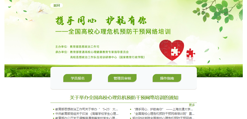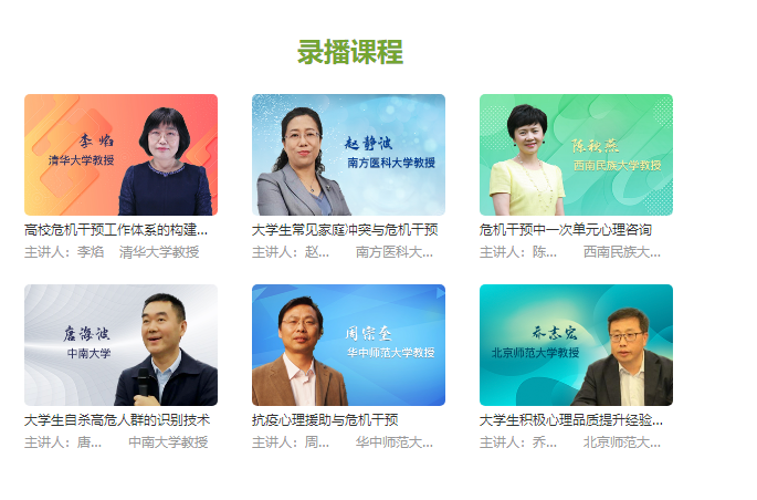 本次培训班由教育部普通高校心理健康教育专家指导委员会和高校思想政治工作队伍培训研修中心(国家教育行政学院)举办,包括四个环节:直播课程、录播课程、主题研讨、心得撰写。来自清华大学的李焰教授、南方医科大学赵静波教授等知名高校的专家、学者做了《高校危机干预系统的构建和完善》、《大学生常见家庭冲突和危机干预》等十二个专题培训。