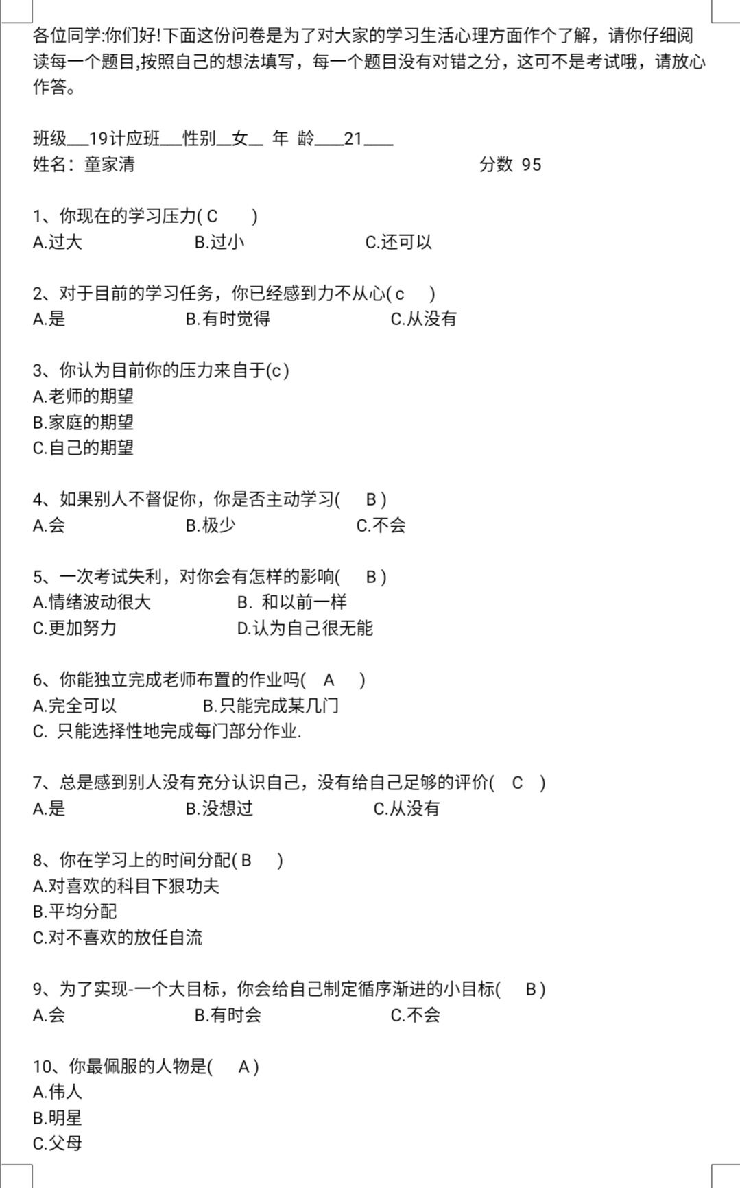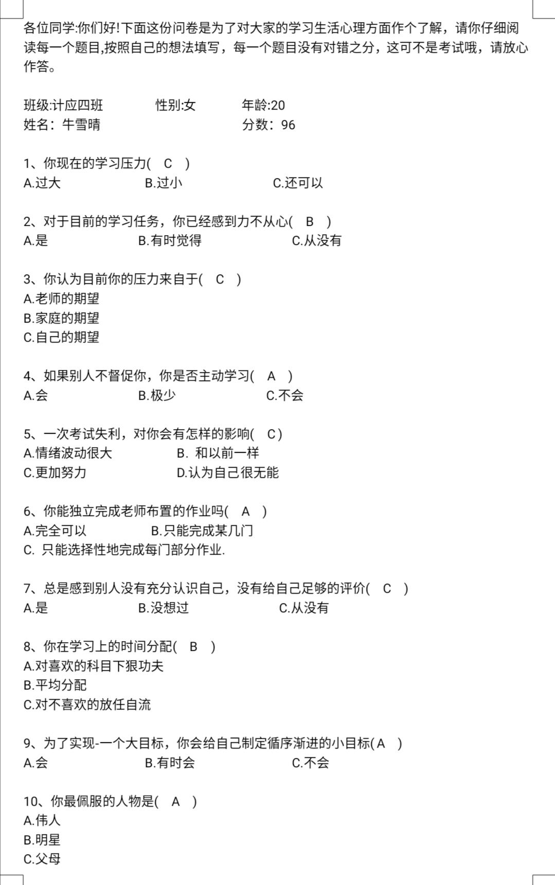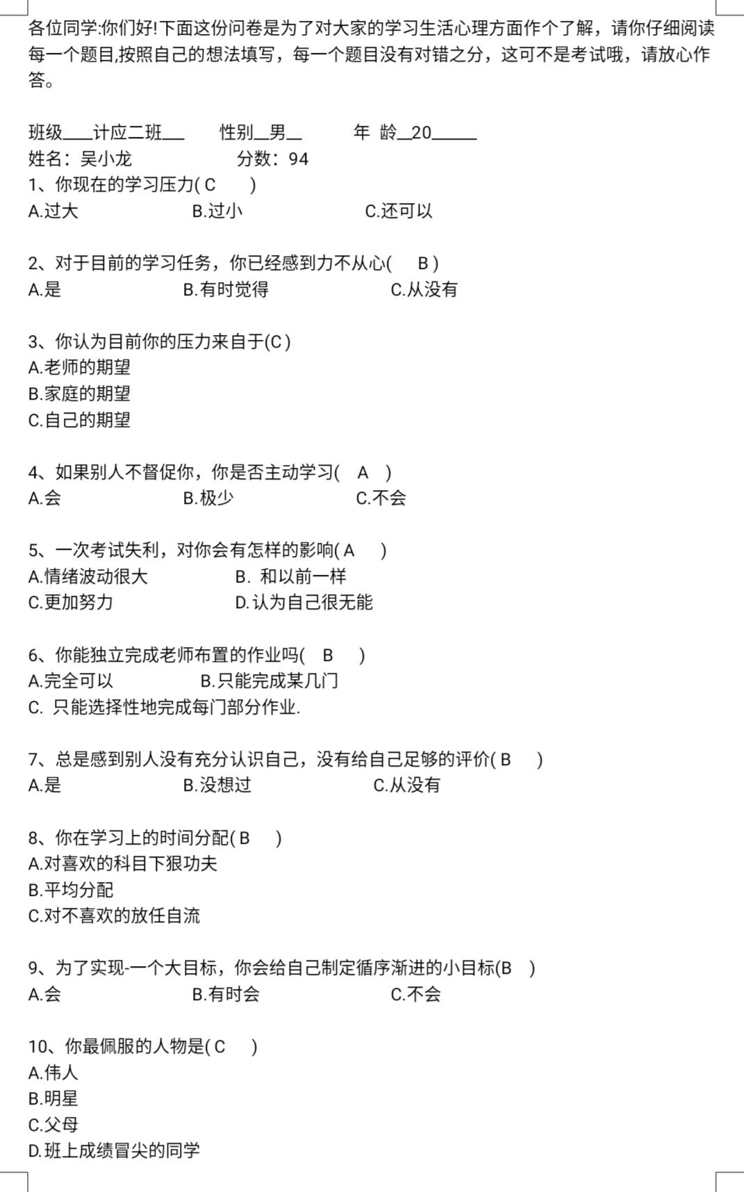 然而本次活动期间由于部分学子未能返校,所以将以线上答题形势开展。但在同学们的积极配合之下,仍可发现我们青少年的蓬勃之气和对参加校活动的热情。而由以下部分同学的答卷情况来看同学们心理健康程度还是较为合格的。