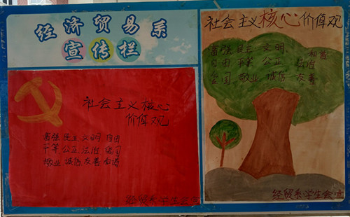 为弘扬社会主义核心价值观,让同学们对社会主义核心价值观有个深入的认识。2016年4月17日,经济贸易系积极开展社会主义核心价值观海报宣传活动。