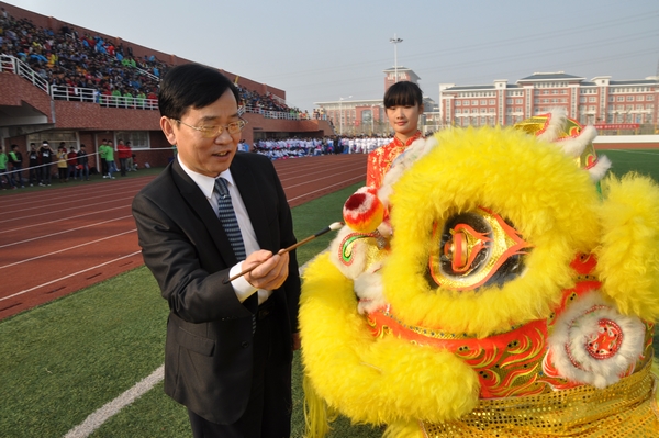 当所有运动员方队入场完毕,全场肃立,运动场上响起激昂的国歌。院党委书记沈中林宣布运动会开幕。院长李柱梁及合作企业副董事长孙元俊为舞狮队两只狮子点睛。副院长吴大明主持开幕式。院领导牛春雨、汪上、刘宏、穆松出席开幕式。