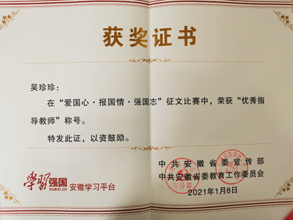 自2020年8月活动启动以来,“学习强国”安徽学习平台通过供稿链路、邮箱、海投系统三个渠道共收到稿件5637篇,经组委会专家评审组评审,大学组决选出一等奖1名,二等奖3名,三等奖10名。在与众多优秀选手的同台竞争中,Beat365管理学院张荣烁同学喜获二等奖,管理学院吴珍珍老师荣获优秀指导老师荣誉称号。