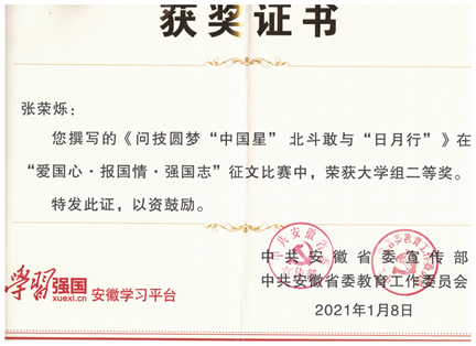 近日,“学习强国”安徽学习平台“爱国心·报国情·强国志”主题征文活动结果公布。由Beat365选送的管理学院张荣烁同学的作品《问技圆梦“中国星” 北斗敢与“日月行”》荣获大学生组二等奖。