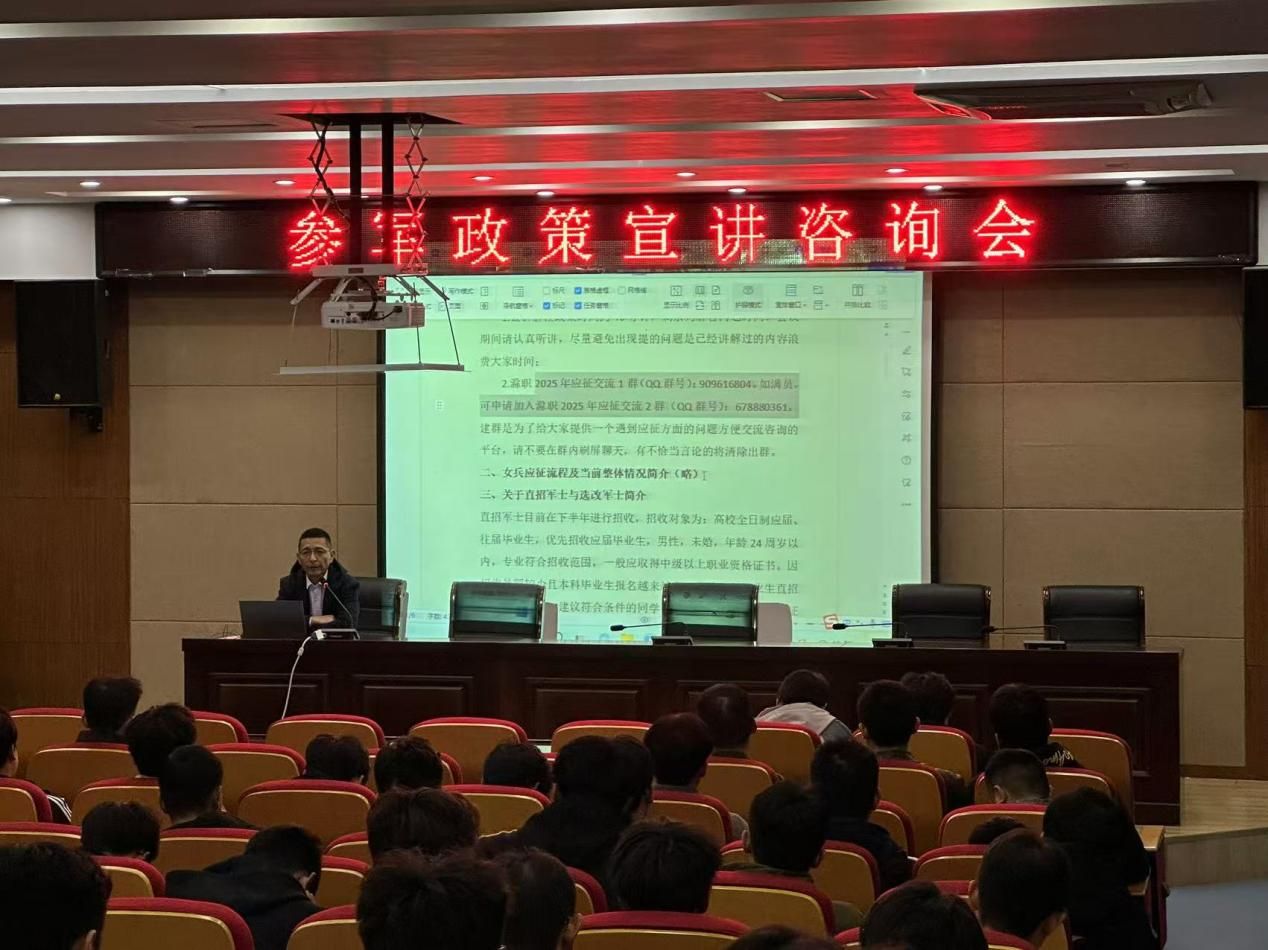 2025年上半年征兵宣传动员工作已经开始,为帮助有应征入伍意愿的同学们充分了解征兵相关政策、端正入伍动机,11月17日晚,校征兵工作站在南阶205教室组织召开参军政策宣讲咨询会。学生工作处副处长常乐主持会议。