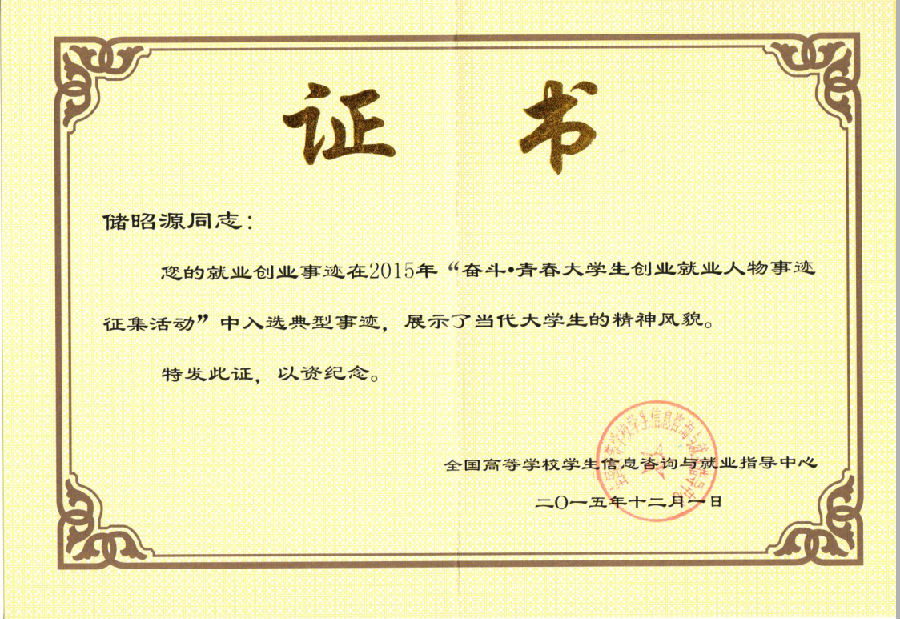 2012年初,储昭源在学院大学生创业孵化基地创办了“安徽清风电脑耗材销售部”,2013年5月国务院副总理刘延东来学院调研考察时充分肯定储昭源的创业精神。6月,储昭源同学于计算机辅助设计与制造专业学成毕业并荣获”安徽省十佳大学生提名奖”。储昭源多次被学院评为“创业实践先进个人”,中国教育电视台、安徽教育网等多家媒体报道过他的创业事迹。2015年他又荣获安徽省“创新创业典型人物”和“双创之星”称号。