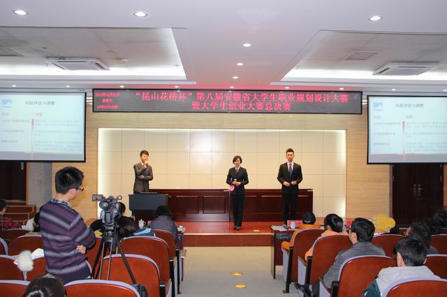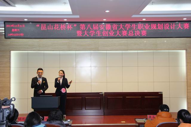 决赛中,学院选手激情展示他们的职业规划与创业项目,机智应答评委提问,展现当代大学生的青春与活力,得到了评委和师生的一致好评。最后,由机电系的李星宇、宋庆园和郭庆带来的“安徽派尔尼电热工程公司”获获“安徽省大学生创业之星金奖” ;马莹(信息系)和纪明建(土木系)带来的“安徽361数据安全公司”荣获“安徽省大学生创业之星银奖”;信息系周旭静(就业组)荣获“安徽省大学生职业规划之星银奖”。