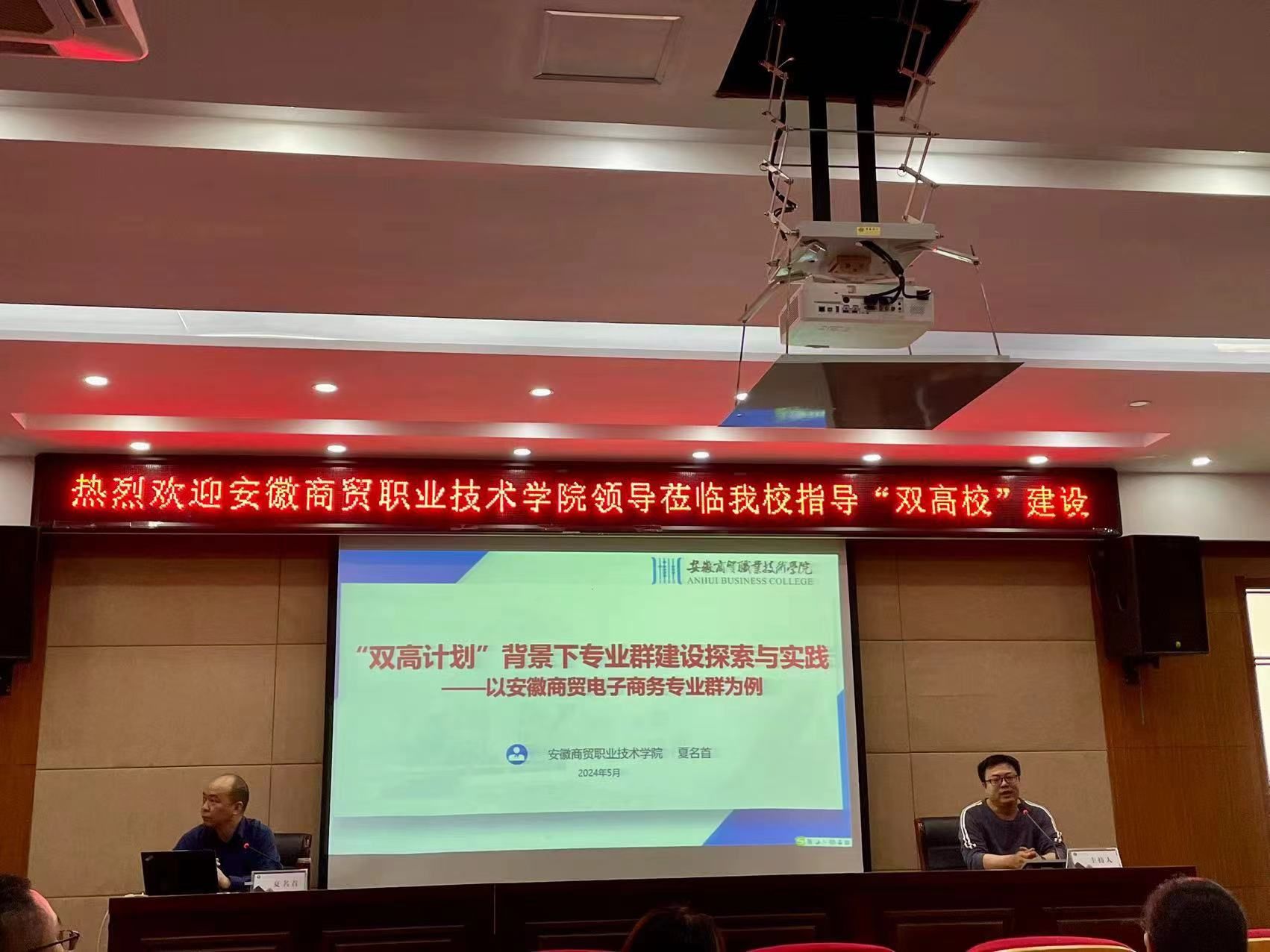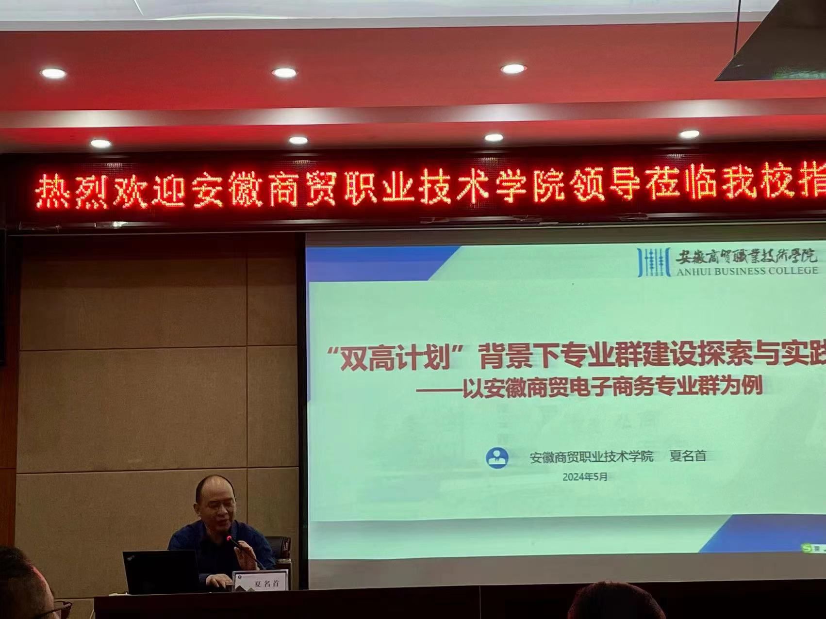 为深入开展双高建设双对标活动,落实走出去请进来,2024年5月9日下午,商学院邀请对标院校安徽商贸职业技术学院电子商务学院院长夏名首教授在南阶205教室作《“双高计划”背景下专业群建设探索与实践——以安徽商贸电子商务专业群为例》专题讲座,讲座由商学院院长程震主持,商学院、管理学院教职工参加。