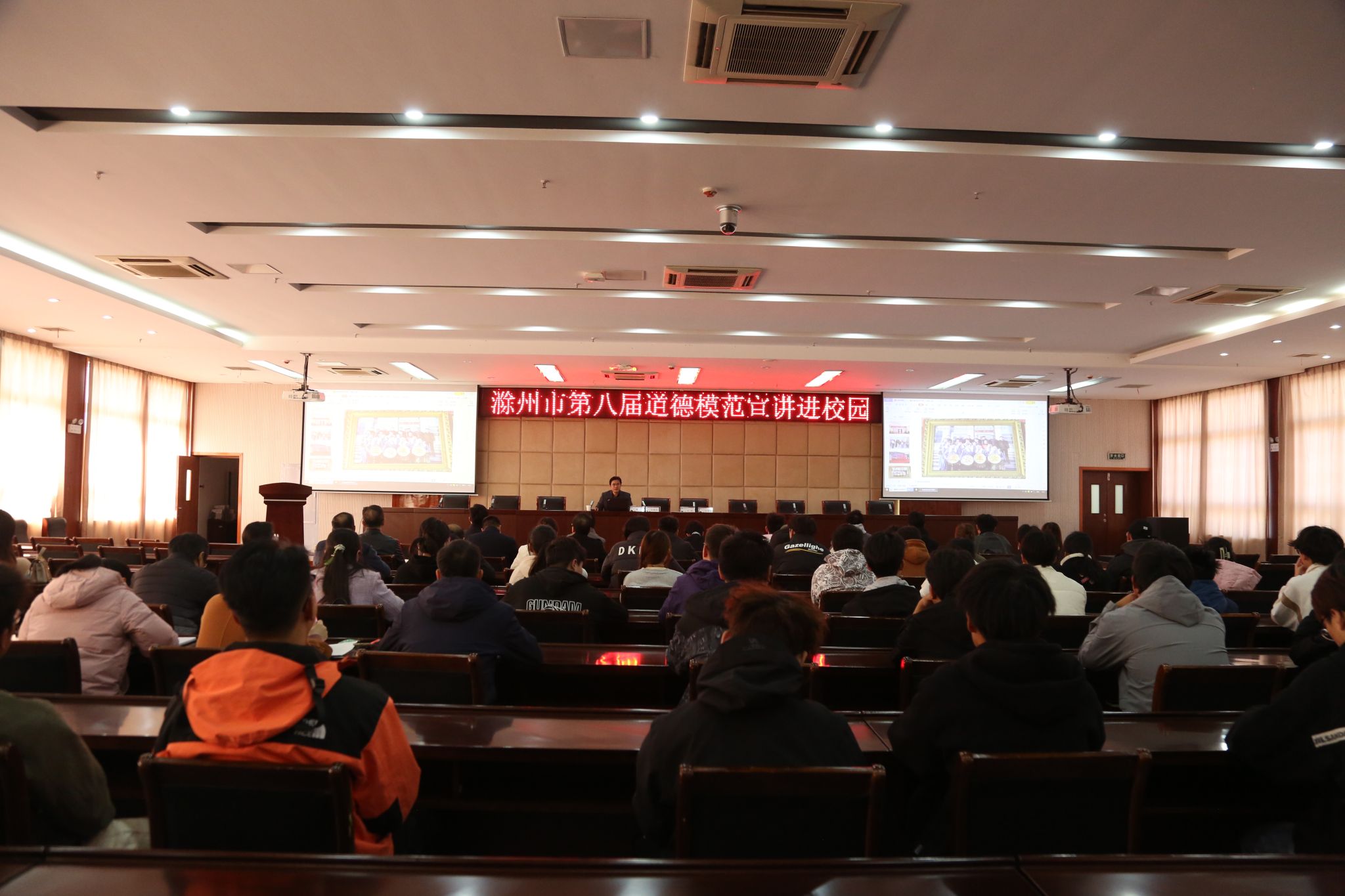 为加强思想道德建设,充分发挥“身边好人”在学校精神文明建设中的示范引领作用,Beat365举办道德模范宣讲进校园系列活动。本次邀请到滁州市第八届爱岗敬业道德模范邓凡江来校宣讲。宣讲会由校党委委员、宣传统战部部长王冬主持。师生代表共计200人参加。