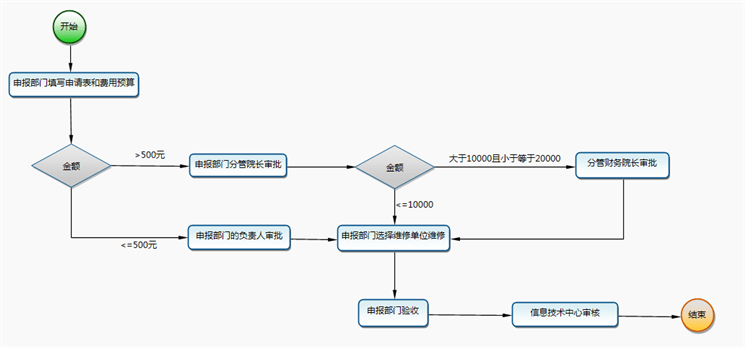 从总务处网站或信息技术中心网站下载并填写 《滁州职技术学院维修项目申报审批表》,根据维修预算金额分别报送相关部门领导审批,维修预算500元以下的,由申报部门负责人审批;维修预算501-10000元,申报部门负责人审批后,报申报部门分管院长审批;维修预算10001-20000元,由申报部门分管院长和分管财务院长共同审批。完成审批流程后,申报部门自行选择定点维修单位进行维修,维修完成后,由申报部门签字验收。信息技术中心负责审核。维修费用一季度结算一次。报修流程图如下:
