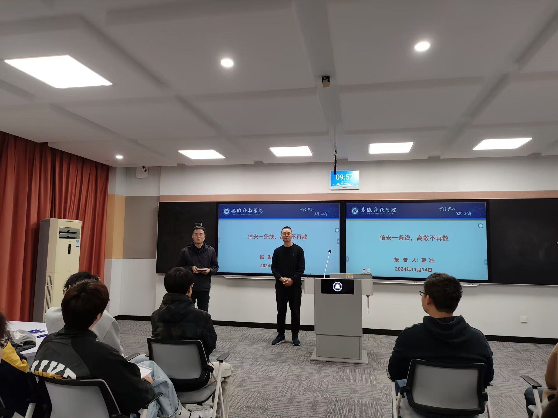 曹浩教授在讲解离散数学中的信息安全这一重点内容时,他结合实际案例,详细介绍了离散数学中的集合论、图论、布尔代数等知识在密码学、网络安全协议设计等方面的具体应用,如通过集合论来理解信息的分类与加密,利用图论分析网络拓扑结构以保障信息传输安全等,使抽象的理论知识变得生动形象、易于理解,让在场师生深刻领略到离散数学在信息安全领域的强大应用价值。在讲座过程中,曹浩教授还与师生们进行了积极互动,耐心解答大家提出的问题,现场气氛热烈。