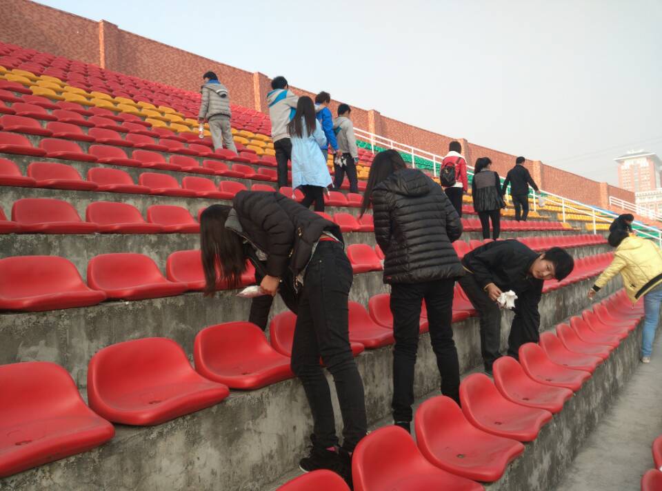2014年11月21日,信息工程系2014级嵌入式班级全体同学来到学校体育场开展卫生清扫活动。下午同学们打着横幅、团旗排着整齐的队伍来到体育场,清洁座位垃圾。同学们按照分工,展开清扫活动;打水的、擦拭座位的、清扫步行道的,一派繁忙景象;经过2个多小时的清扫,使体育场干干净净、焕然一新。 此次活动是信息工程系培育和践行社会主义核心价值观的成果之一,不但帮助解决了体育场清洁问题,而且同学们也都感受到了践行核心价值观,服务他人的快乐。