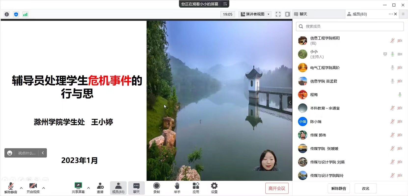 为深入学习宣传贯彻党的二十大精神,提升学院专兼职辅导员学生管理能力,1月10日下午,信息工程学院在学生处的安排下,组织专兼职辅导员参加2022-2023寒假辅导员业务能力培训。培训由滁州学院党委学工部副部长副教授王小婷博士讲授,培训主题为“辅导员处理学生危机事件的行与思”。