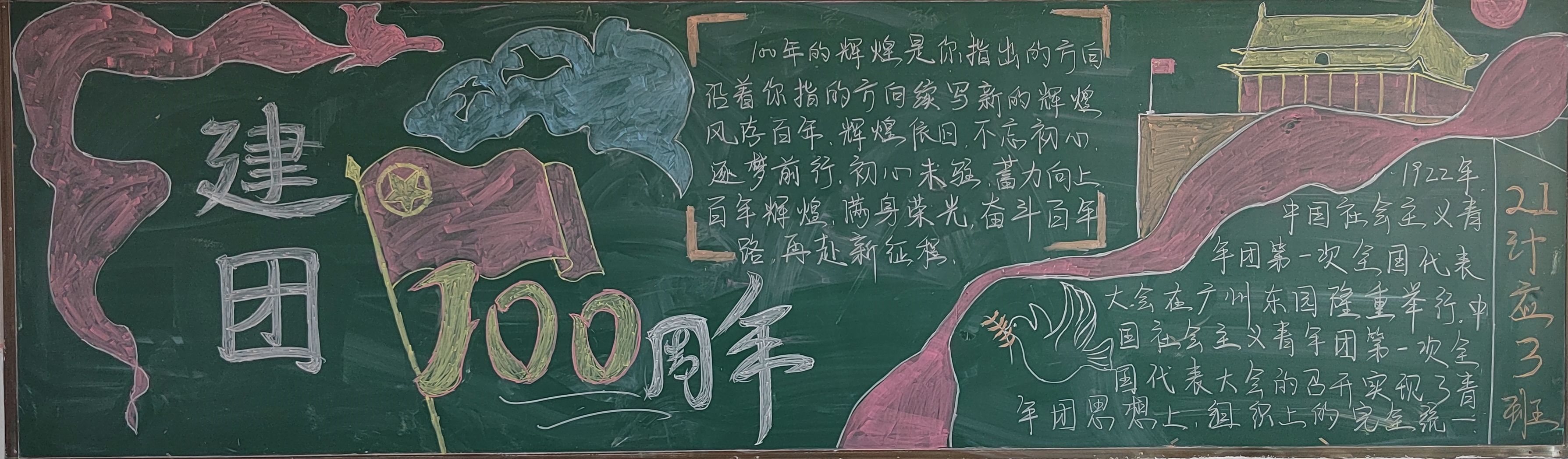 为庆祝中国共产主义青年团成立100周年,深化我院青年学生对共青团悠久历史和光荣传统的认识理解。5月4日下午,信息工程学院学生会开展了以“共青团成立一百周年绽芳华 共绘蓝图迎盛世”为主题的黑板报评比活动,带领团员青年重温百年团史,传承红色基因。