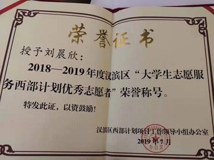 在脱贫攻坚这个光荣的岗位上奋斗了一年,刘晨欣被评为了陕西省安康市汉滨区“大学生志愿服务西部计划优秀志愿者”。以青春之名,践扶贫之诺,他在服务期满之际又向组织申请延长服务,继续在陕南山区脱贫攻坚的最前线书写壮丽的青春答卷。