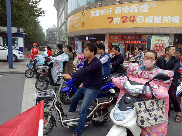 志愿者们分成两队,每队两人进行交通劝导,两队分别站在马路对角的非机动车过道两旁,来劝导行人和骑非机动车的人注意交通规则,不越过白线以及不能闯红灯。活动过程中,部分行人没有注意到路灯情况,或没有看见路面上的白线,志愿者们会上前及时提醒,行人也会积极配合工作,耐心等待红灯,或者退回到白线之内。