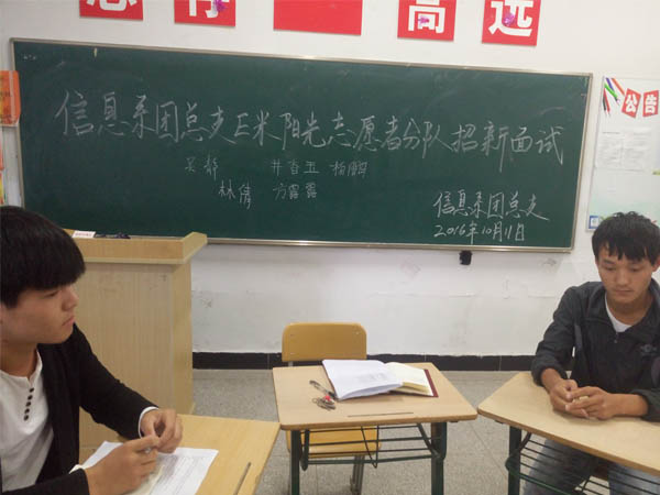 10月11日中午面试正式开始,志愿者们提前来到目的地做好准备工作,报名的新生们12点准时到达现场。场外的志愿者们不停地忙碌着,面试场内想要成为青年志愿者的选手们也紧张着。然而,紧张之外他们更多的是对自己的自信。简短的自我介绍之后需要回答面试员一些问题,选手们各式各样的回答让原本紧张的气氛变得温馨。他们抱着对志愿服务的热情,捧着自己的奉献之心,展示着自己最精彩的一面。但是,成为服务队的一员却也不是那么简单,除了志愿精神之外,还要考虑各方面的因素,面试活动如火如荼的进行着……