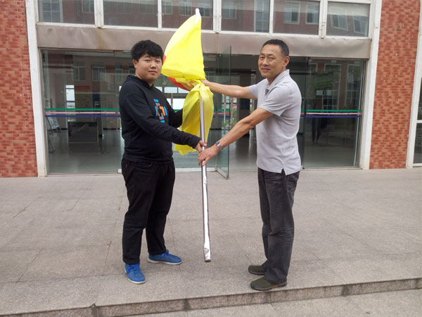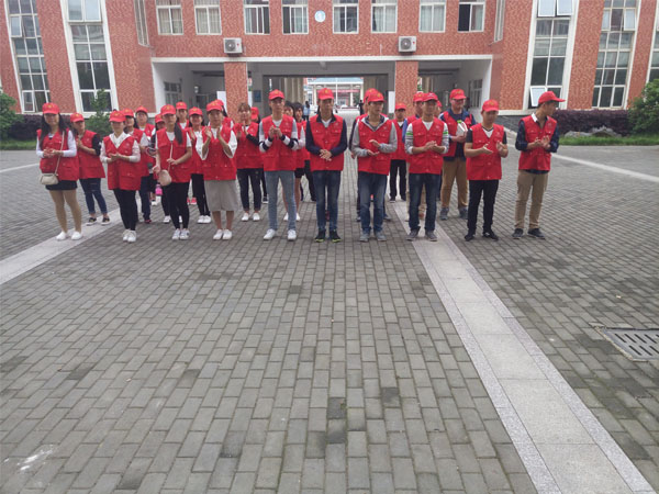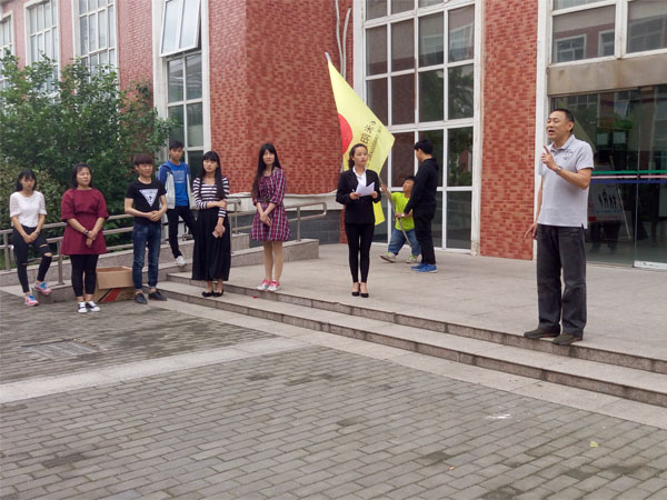 仪式分为三项,分别是服务队队长发表演讲、程书记授旗、程书记讲话以及志愿者们合影留念。35名志愿者穿着醒目的志愿者服,整齐的排列在二号楼下,接受着心灵的洗礼。