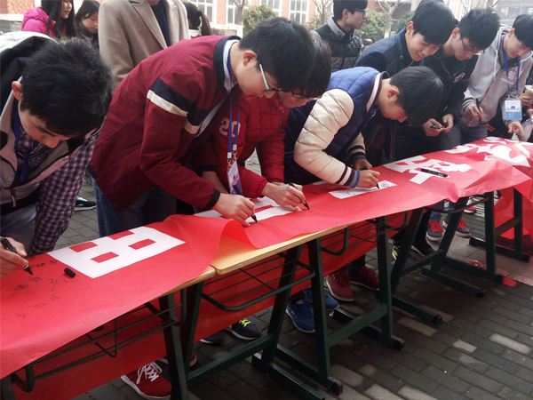 以往的男生节活动都举办的相当精彩,并得到领导老师和同学们的一致称赞。当然,让男生节的活动更加精彩,我系部也将展开更全面的活动。最后,各班级代表、学生会成员和赵盼盼老师依次在横幅上签字,预祝本次男生节举办成功!