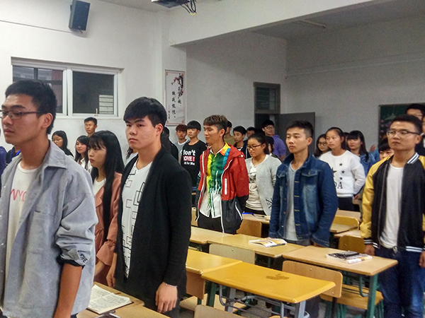大会开始第一项,全体成员起立奏国歌。大会进行第二项,由15级团总支副书记王松厚上台发言,他简单的介绍了接下来的工作计划以及表示认真工作的决心。接着,组织委员殷子与宣传委员余周童也认真的做出了任职报告以及接下来的工作规划。随后,E米阳光志愿者分队队长上台发言,表明了志愿者的意义,也表示会更加努力。