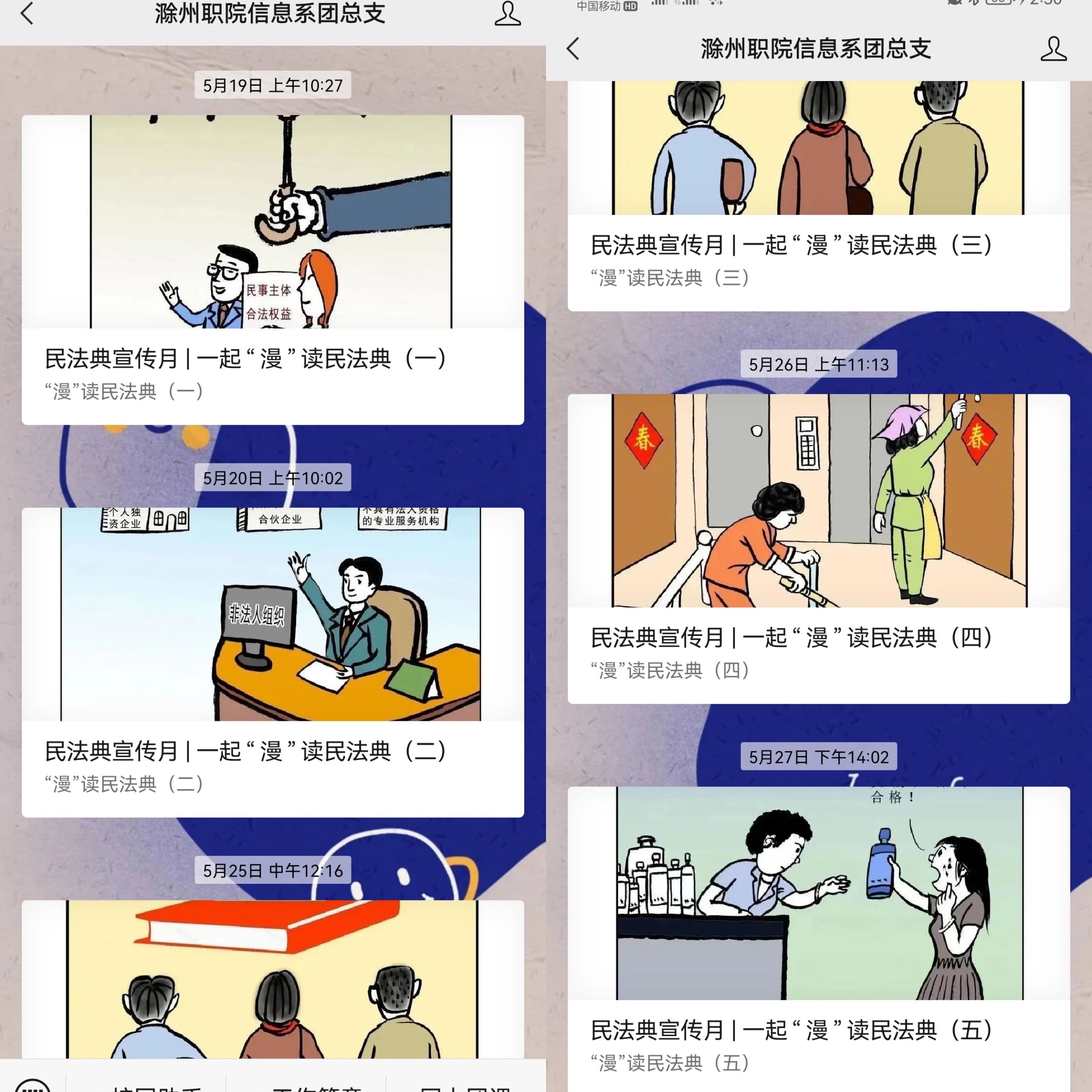 三是民法典微信推送。信息工程学院通过学院微信号推送5篇漫读民法典文章,并积极鼓励学院同学自行学习。