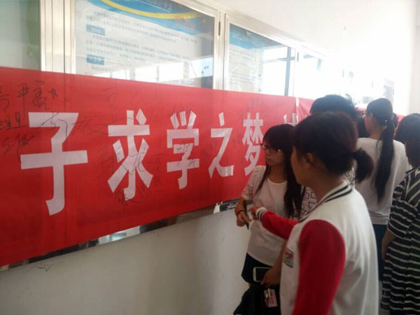 在此次活动过程中,由14级计应一班班长刘金玉带领大家进行了庄严地宣誓, 整个活动现场气氛庄重严肃,充分体现了同学们对诚信贷款、诚信还款践行的决心。最后,参加活动的同学们在“助学贷款圆莘莘学子求学之梦,诚信还款塑当代青年完美人格。”横幅上签名并留影纪念。