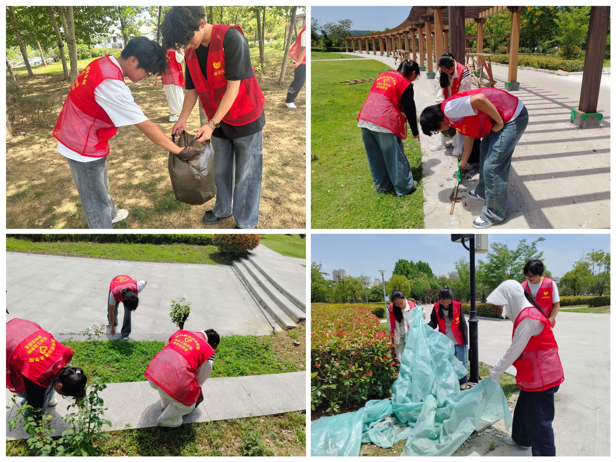 6 月 5 日世界环境日当天,10余名志愿者走进镜园开展志愿清扫活动。志愿者们手持扫帚、夹子、垃圾袋等清洁工具,分工明确、相互协作。他们仔细清理草坪上的烟头、纸屑、包装袋等垃圾,不放过任何一个卫生死角并且对园区内的宣传栏、座椅等公共设施进行擦拭清洁。
