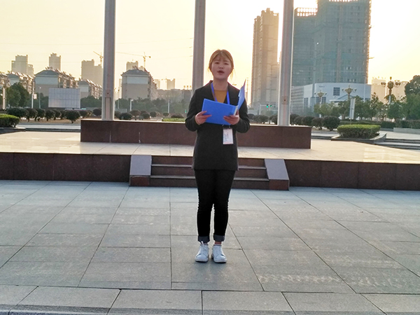 七点整,升旗仪式正式开始。现场随着仪仗队的出现而安静下来,英姿飒爽的国旗护卫队队员们护送鲜艳的五星红旗出场,伴随着庄严的中华人民共和国国歌,五星红旗冉冉升起。升旗完毕后,学生代表在国旗下宣读学习雷锋精神演讲,所有在场学生在横幅上留下签名表达自己的决心,