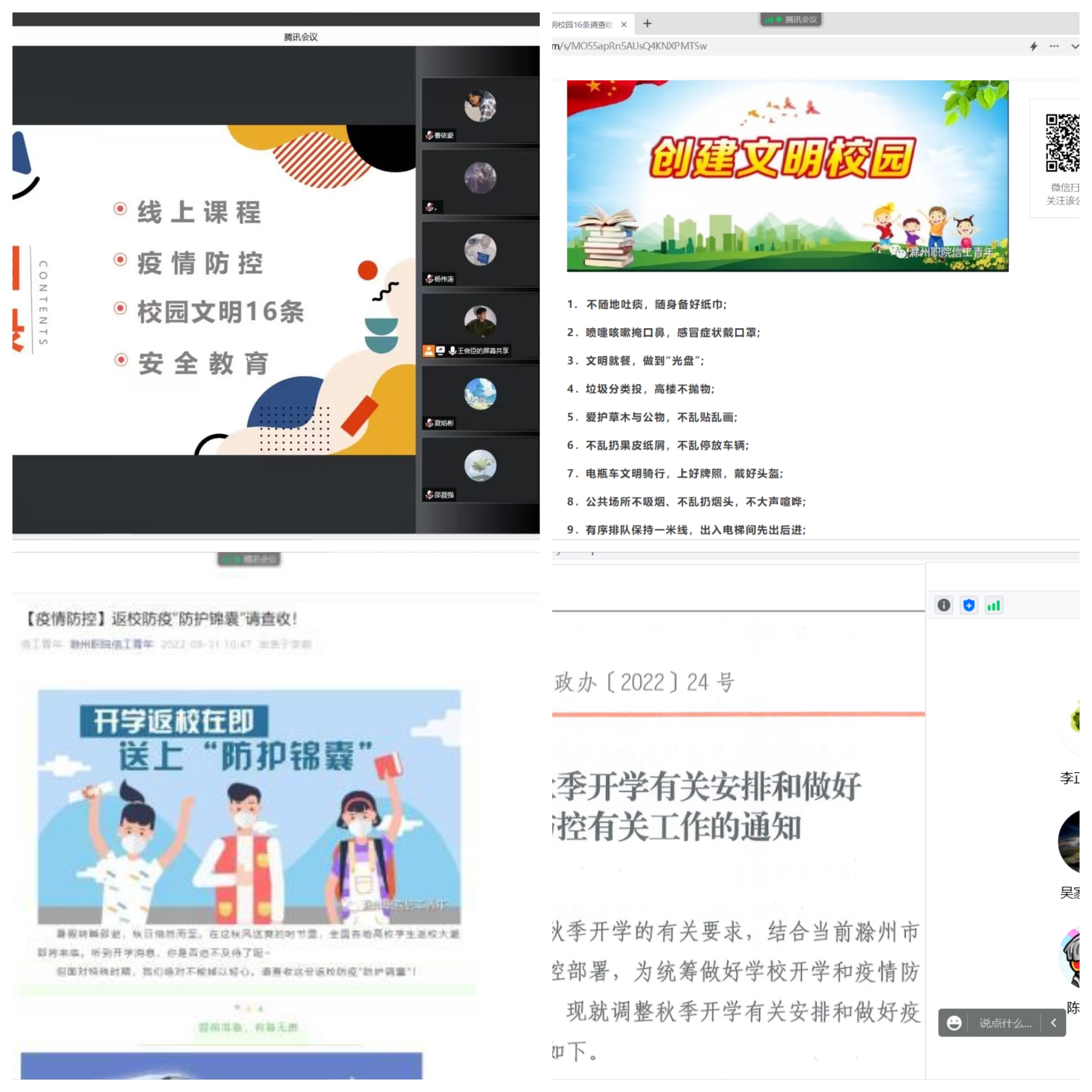 落实学校要求,全体教师积极参与。9月4日凌晨,针对滁州市疫情防控形势严峻的情况,按照学校要求,学院提出了教职工全员参与,打好学生返校疫情防控攻坚战的要求,连夜通知学生暂缓返校,做好学生思想引导,落实已返校学生的登记和疫情防控工作,同时部署线上教学落。封校期间,忙碌的身影和亲切的声音出现在了宿舍、餐厅和手机中,向学生讲述学校封闭管理的必要性和相关要求,了解学生的思想动态和生活担忧,提醒学生做好个人防护,服从管理安排。